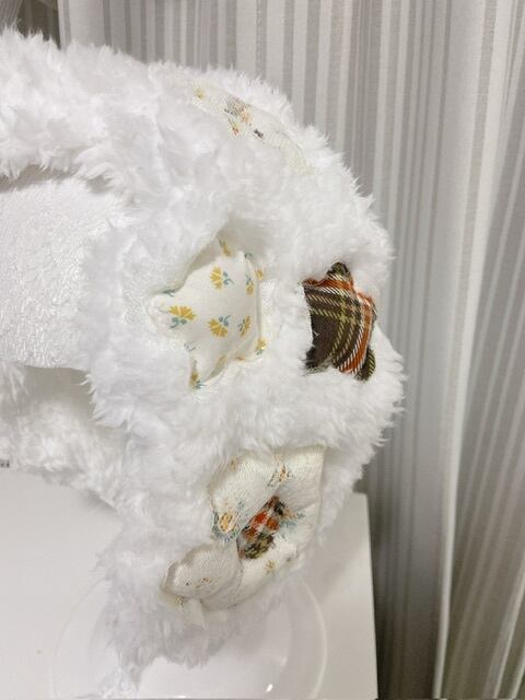 はなかんむりシリーズのイヤーマフです✴︎ ブラウン系のお花の中にワタがはっててぷくぷくに製作しています◎ ▽サイズ 横幅:約58cm 縦幅:約15cm 紐の長さ:約50cm