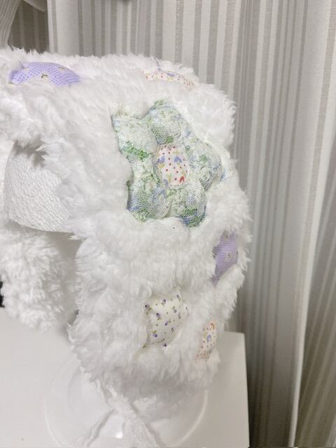 はなかんむりシリーズのイヤーマフです✴︎ ムラサキ系のお花の中にワタがはっててぷくぷくに製作しています◎ ▽サイズ 横幅:約58cm 縦幅:約15cm 紐の長さ:約50cm